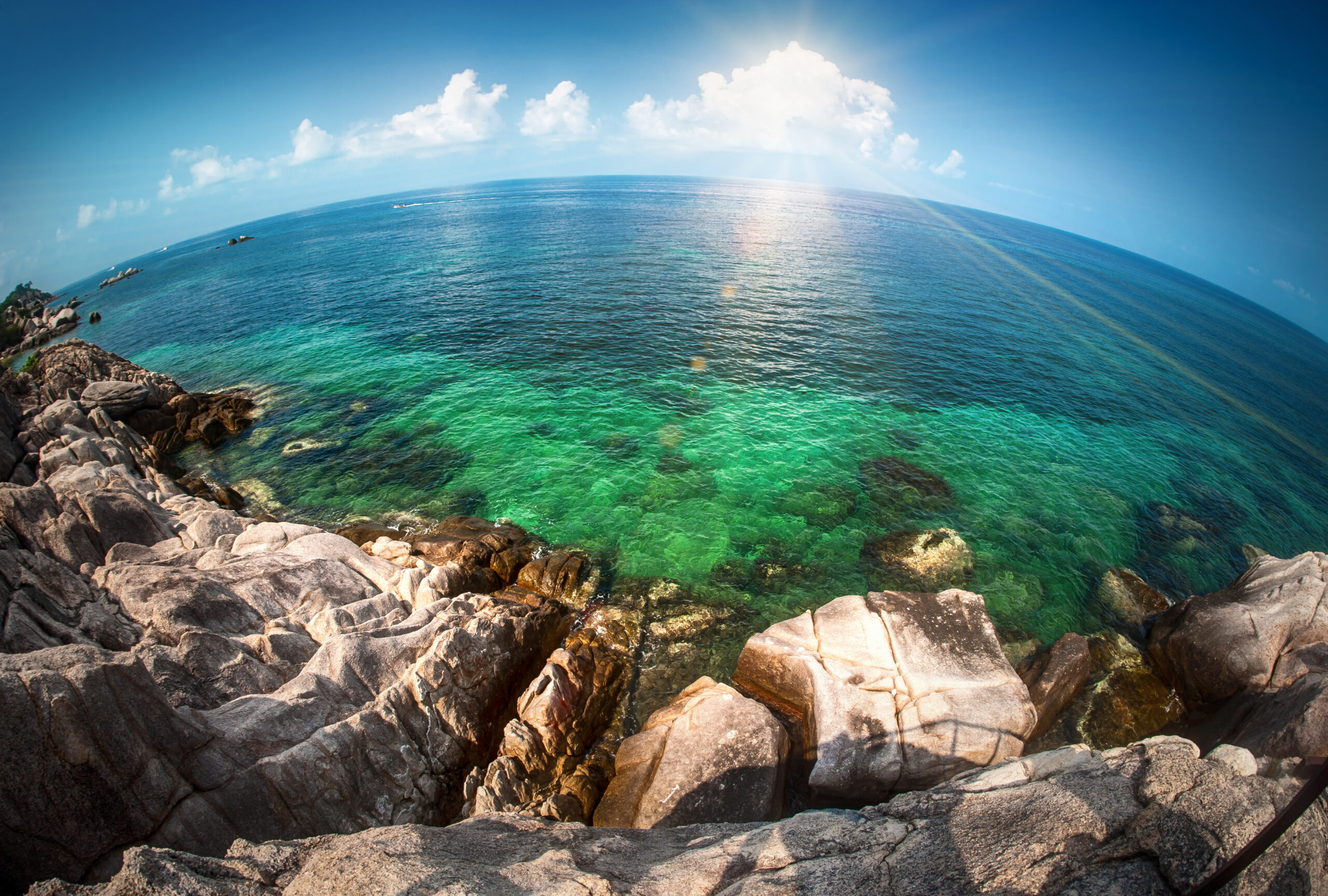 Seascape fisheye view on tropical sea with a huge stones. Vacation concept